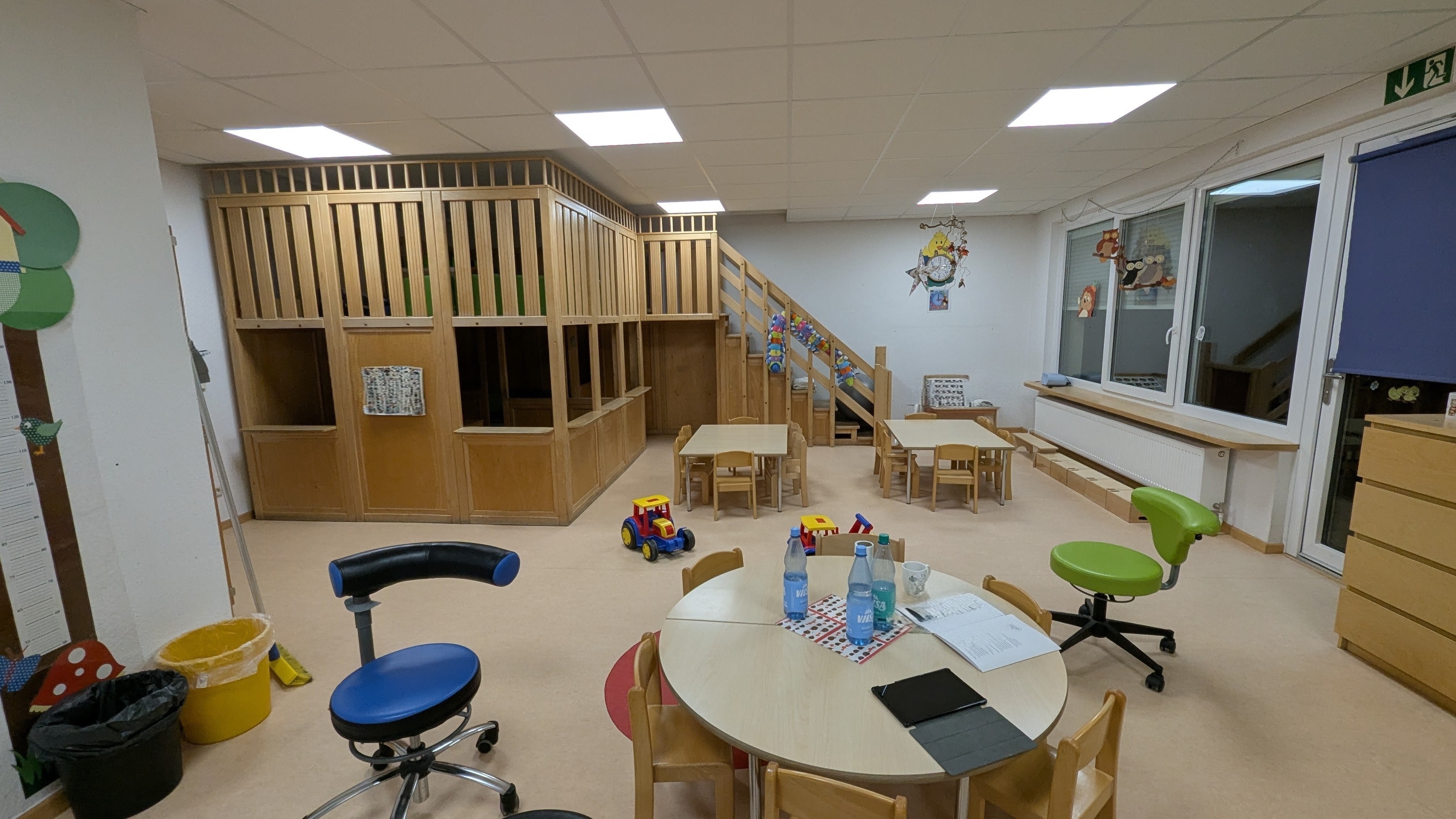 Der Gruppenraum ist über den Flur im Erdgeschoss erreichbar und der Garderobenbereich der Bärchengruppe sowie der Zugang zum Waschraum liegt hinter einer halbhohen räumlichen Abtrennung mit Tür.