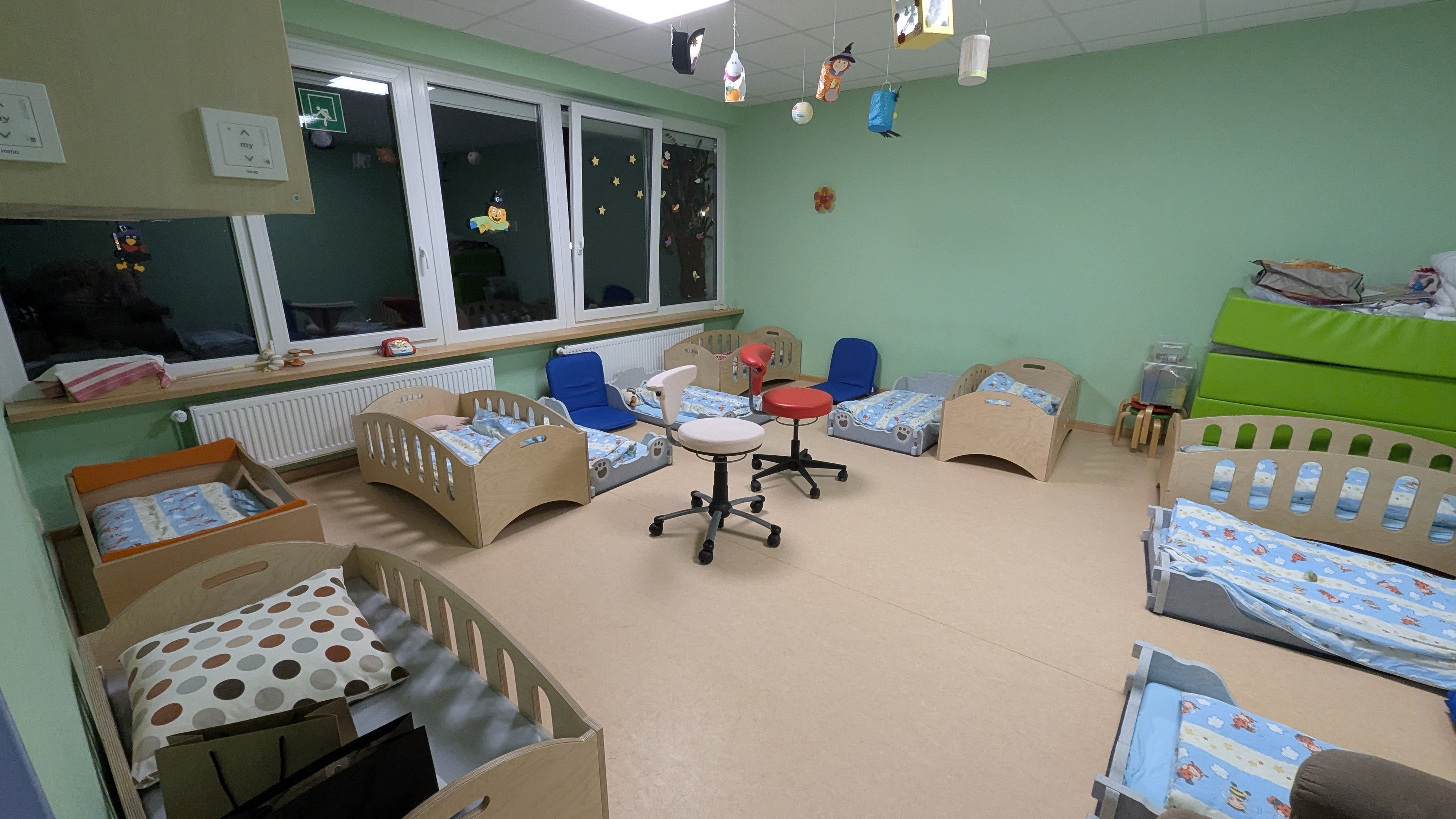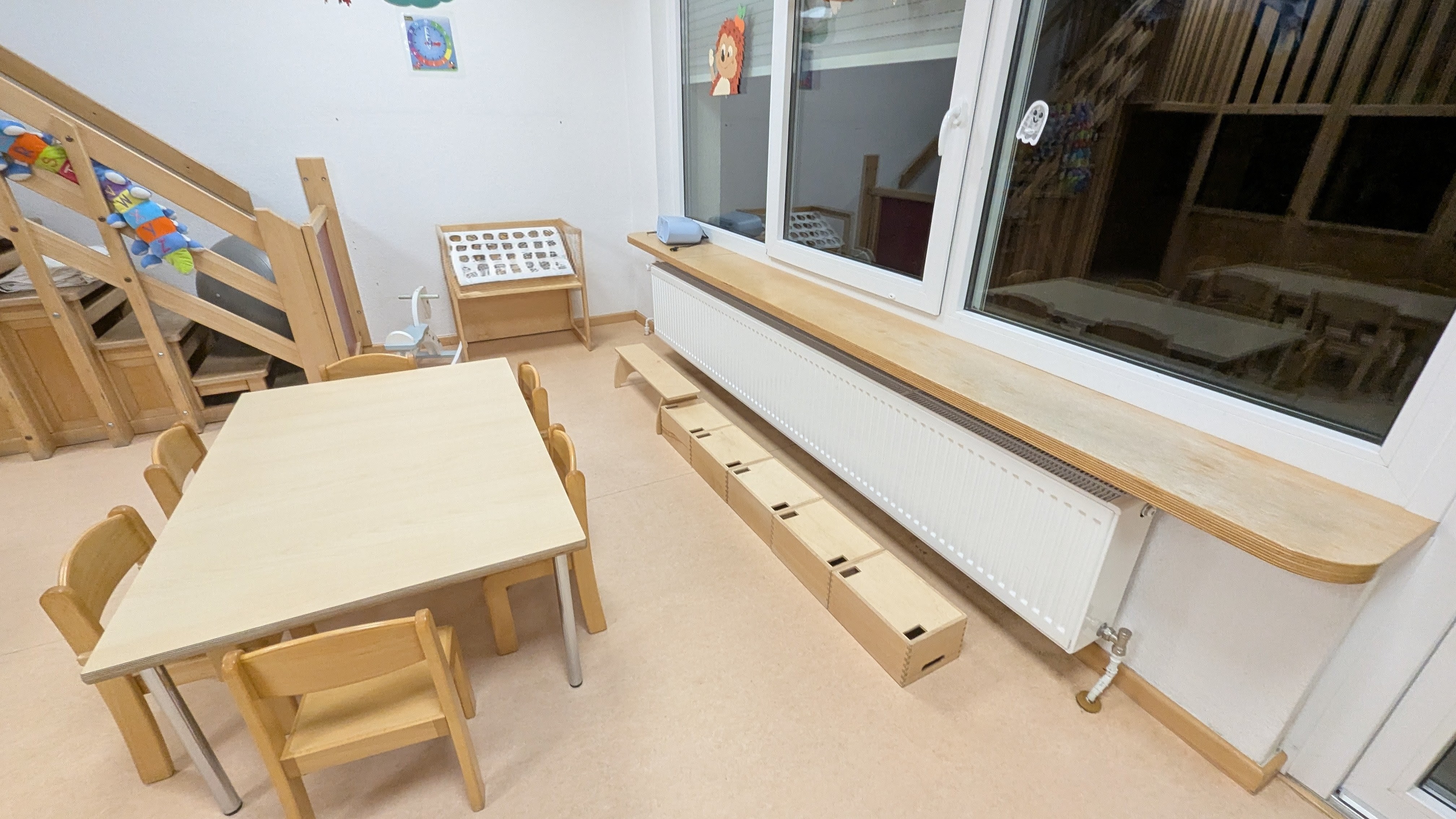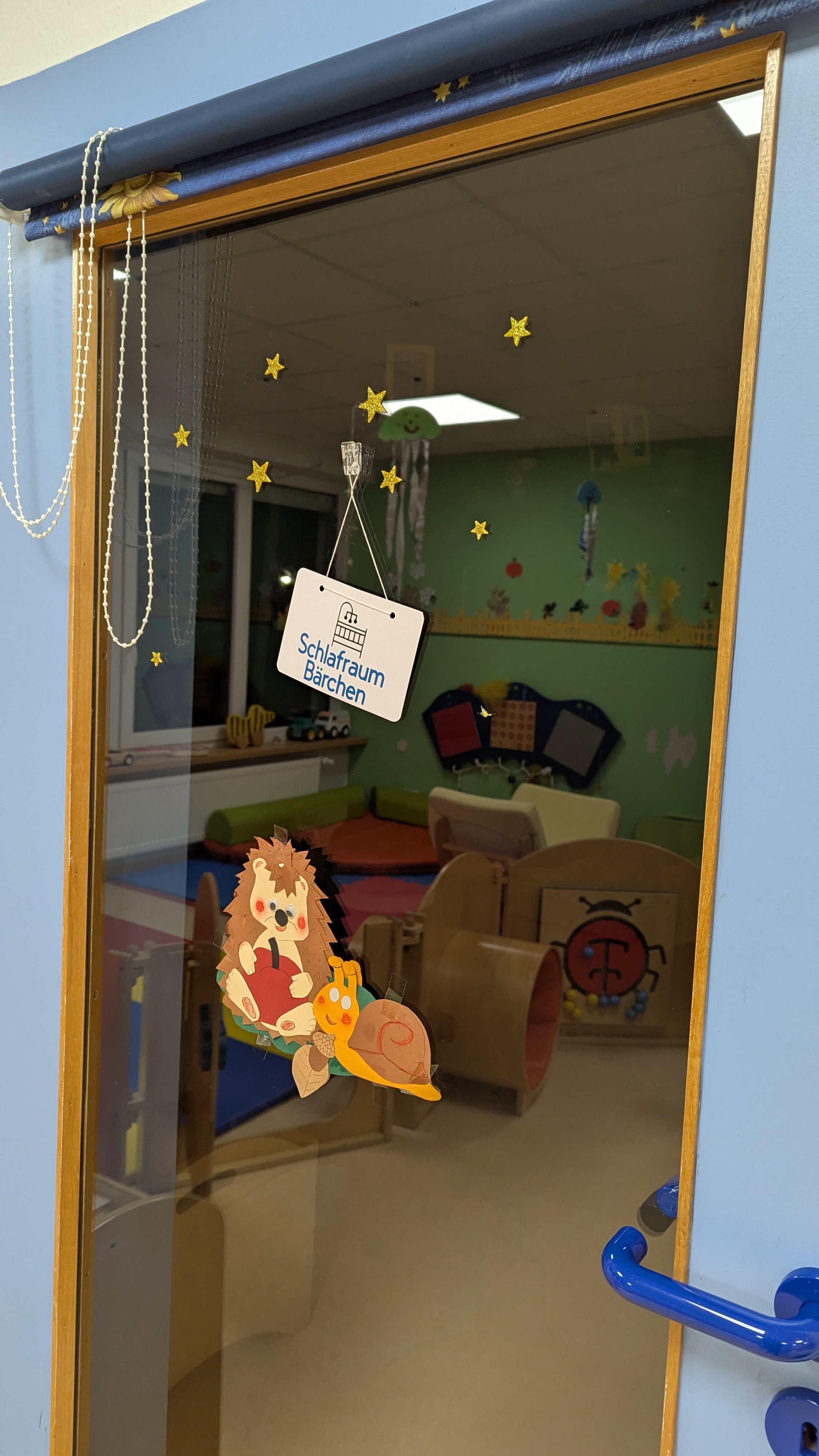 Neben dem Gruppenraum, der mit passendem Mobiliar für unsere Kleinsten ausgestattet ist, steht angrenzend zum Gruppenraum ein Schlafraum mit verschiedenen Betten und Bettwäsche zur Verfügung, in dem die Kinder nach dem Mittagessen zur Ruhe kommen können.