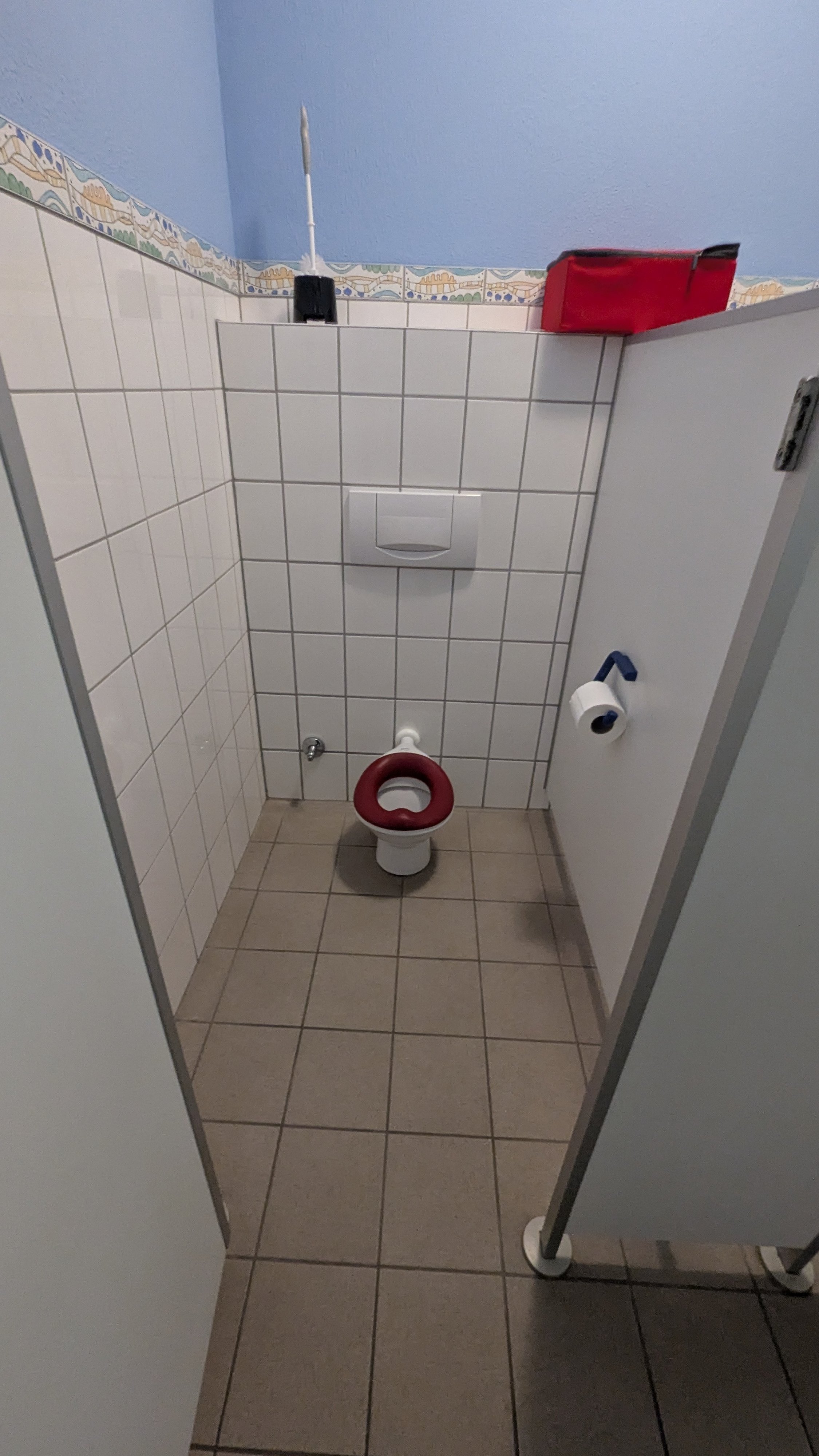 Er ist mit einer Wickelkommode und krippengerechten Waschbecken und Toiletten sowie einer Dusche ausgestattet.
