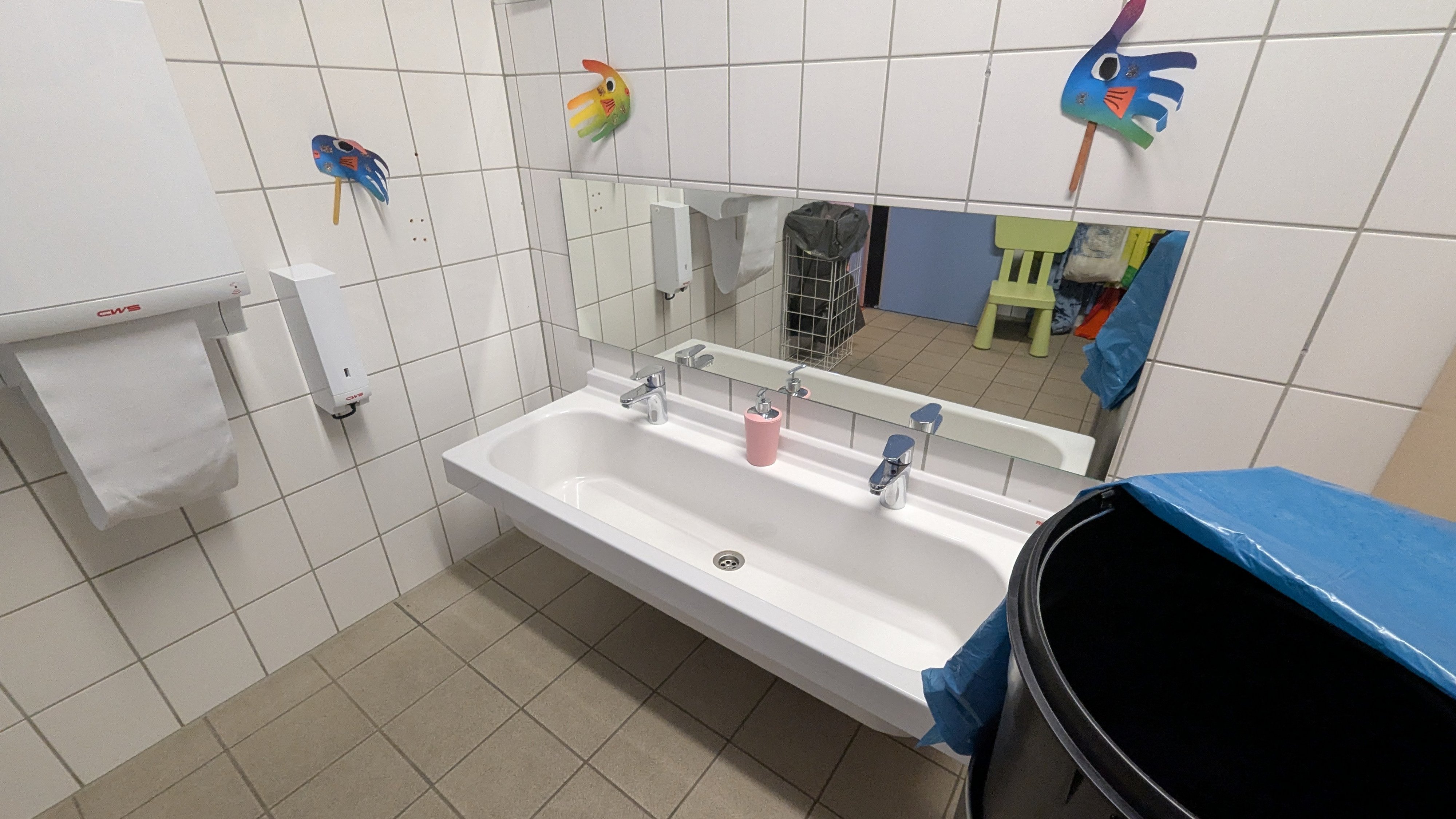 Der Waschraum der Bärchengruppe ist über den abgetrennten Garderobenbereich vom Gruppenraum aus erreichbar.