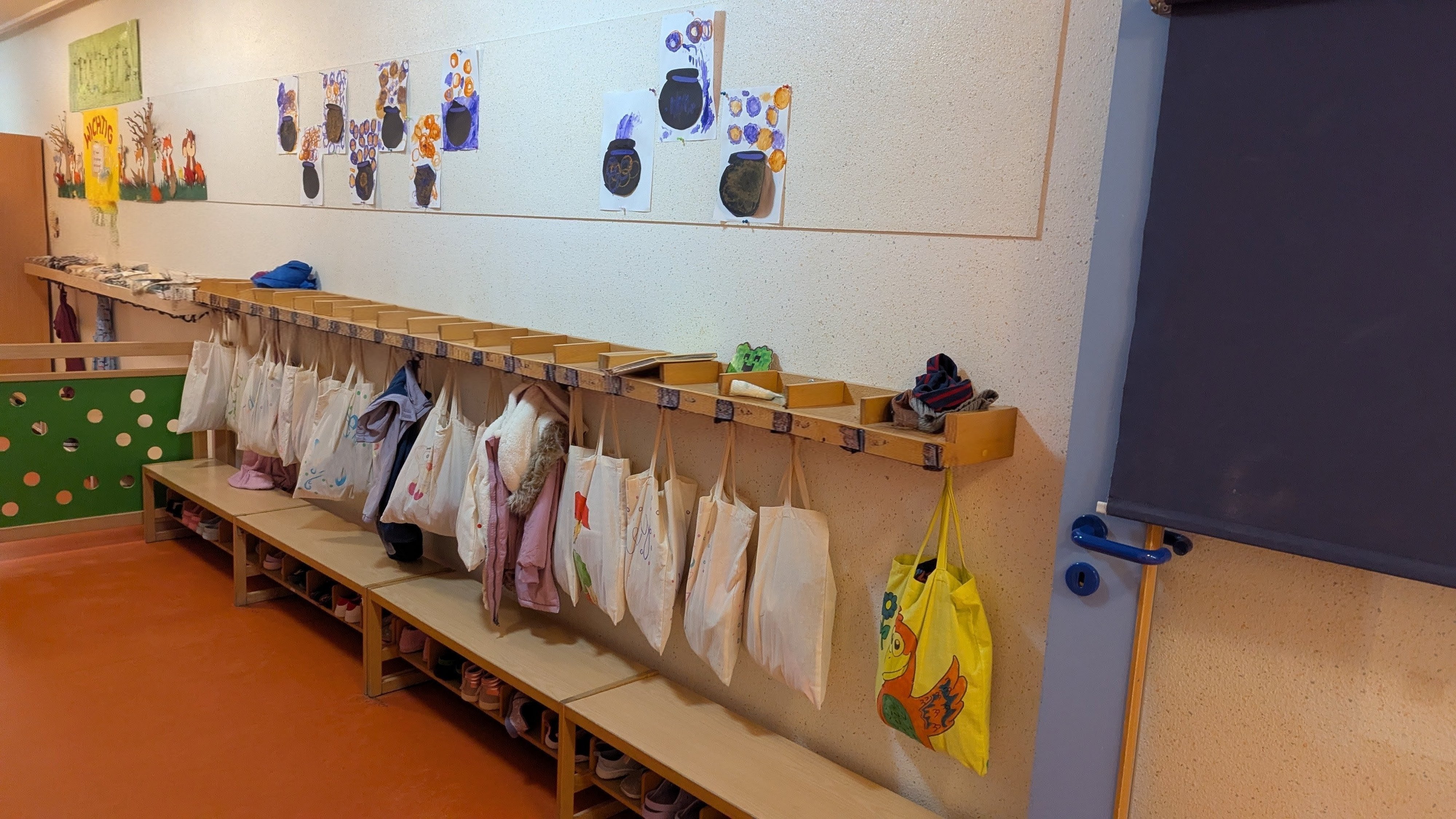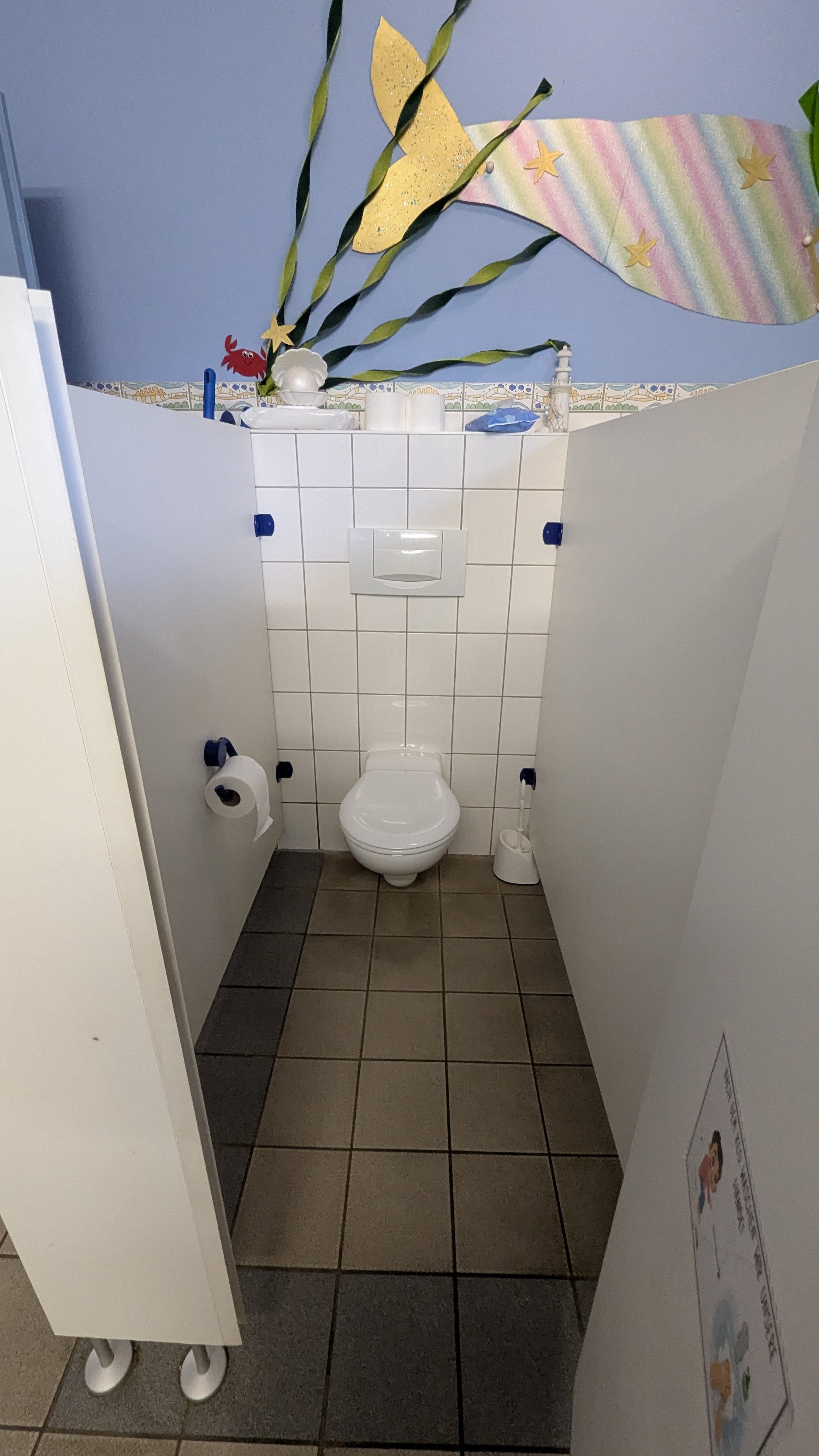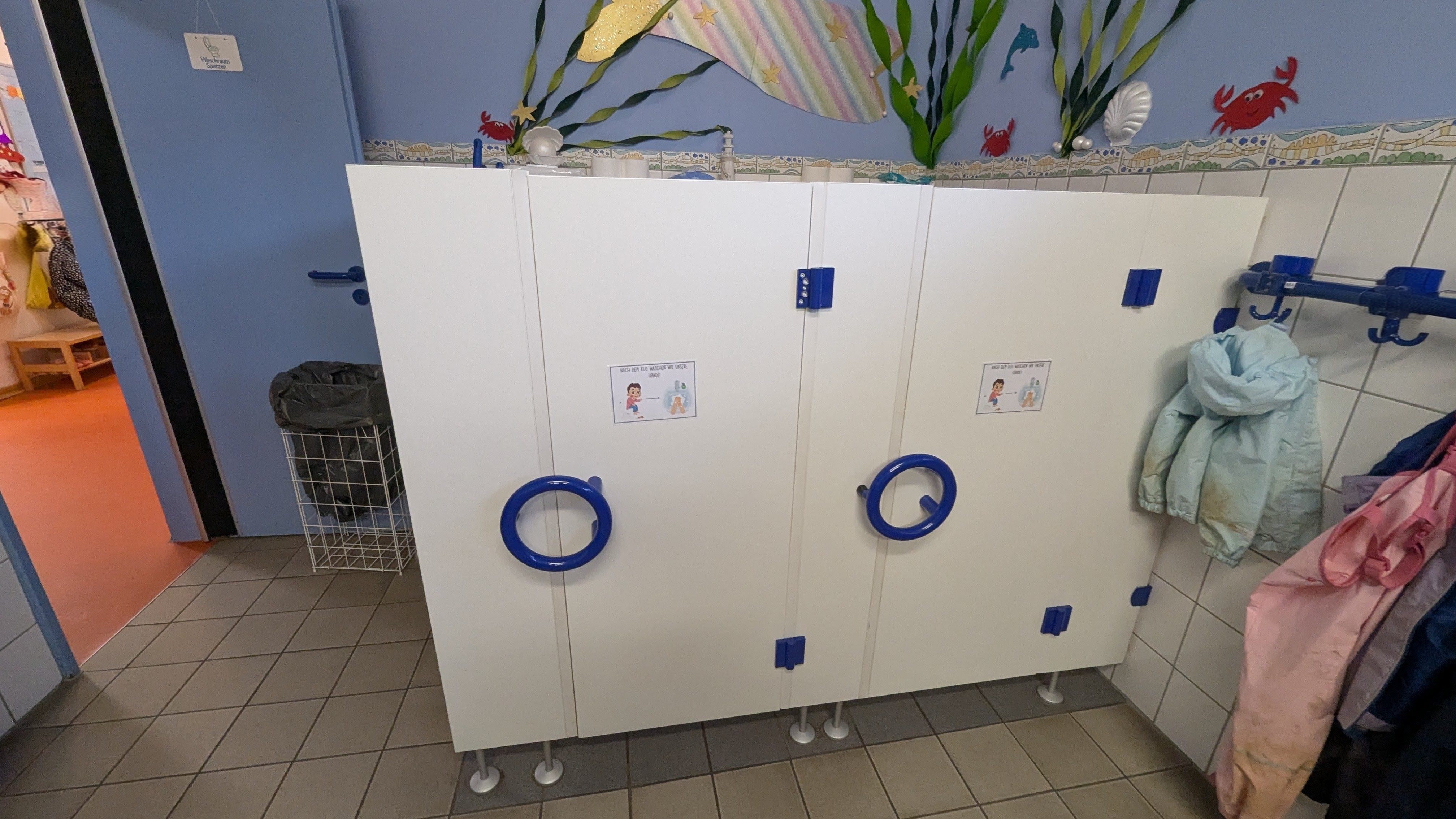 Neben zwei kindgerechten Toiletten und Waschbecken können die Kinder hier ihre Regenklamotten aufbewahren.